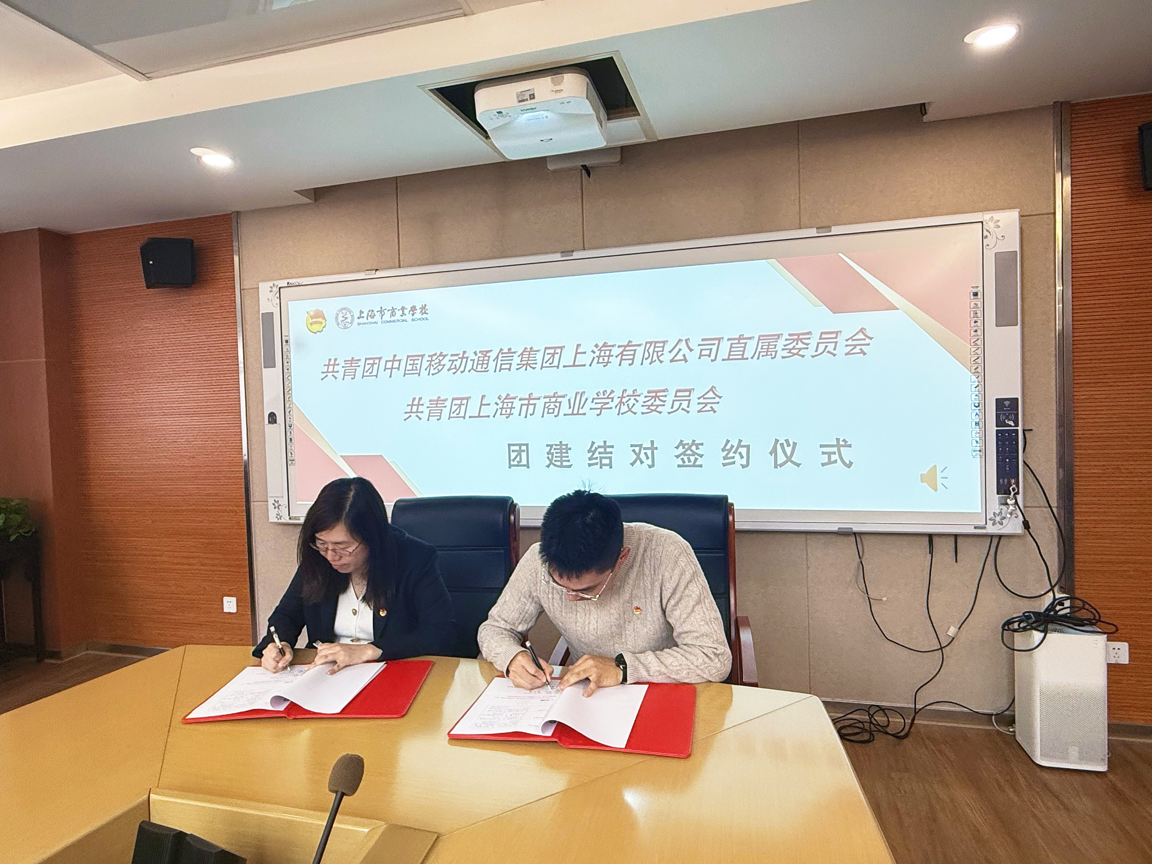 为深入贯彻落实2026年3月中央办公厅印发的《关于加强党建带团建工作的意见》精神,深化党建带团建,推进校企合作深度融合,凝聚青年力量、共育青年人才,4月14日下午,上海市商业学校团委与上海移动直属团委团建结对签约仪式暨“党建引领,团建结对”青年大讲堂第一期在学校致远楼举行。 上海移动党建工作部副主任、团委书记高云卿,上海移动西区副总经理阮中,上海移动直属团委书记夏颖及西区分公司青年代表一行莅临现场;我校党委书记吴轶、纪委书记王丹宁出席,党办、学生处团委有关人员、第24期青年业余党校学员、团课学员及团委学生会干部共同参会。会议由团委书记吴玉恒主持。 活动伊始,上海移动嘉宾一行参观了学校爱心义卖活动与学生表演,近距离感受校园文化底蕴与青年学子的青春风采。随后,双方在致远楼507会议室开展座谈研讨,围绕党建带团建、党建业务融合、青年培养与校企合作等核心内容深入交流,为后续共建工作筑牢基础。 座谈环节,我校党委书记吴轶介绍了学校作为首批国家级重点中等职业学校的办学特色与“三全育人”工作格局;纪委书记王丹宁详解学校德育与共青团工作开展成效。上海移动高云卿书记分享企业党建、团建工作经验与青年工作品牌建设成果,阮中副总经理阐述西区分公司以党建引领业务高质量发展的实践路径,双方就组织联建、资源共享、活动联办、人才共育达成高度共识。