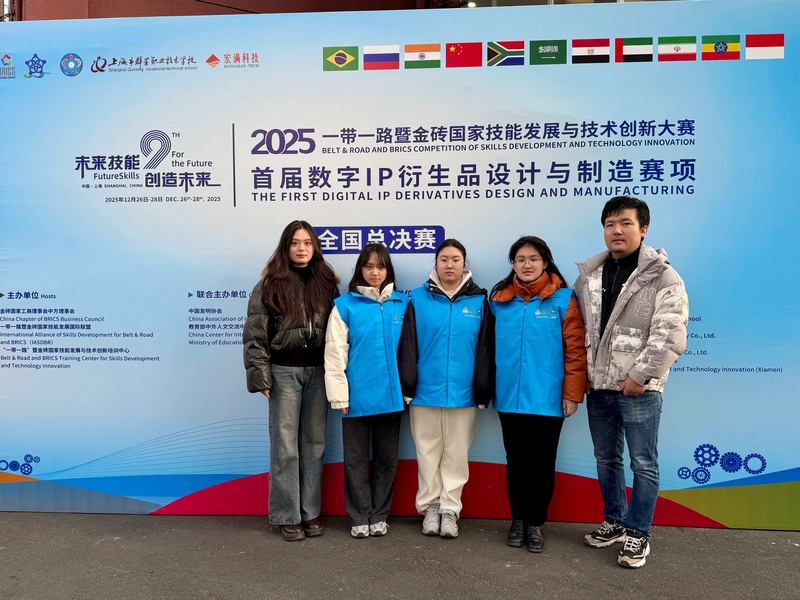 2025年12月28日,2025一带一路暨金砖国家技能发展与技术创新大赛首届数字IP衍生品设计与制造赛项全国总决赛在上海市群星职业技术学校圆满落幕。上海市商业学校创意设计教学部数字媒体艺术241班朱宇佳、吴灵炅、施恩乐三位学子凭借扎实的专业功底与创新能力脱颖而出,斩获中职组全国一等奖、二等奖各1项,学校更以出色的组织协调能力,双获“优秀组织奖”与“最佳组织奖”,彰显了商校在数字文创与技能人才培养领域的过硬实力。此次赛事中,数字影像技术专业负责人金鑫、骨干教师程婉秋全程深耕指导,为学子们的优异表现筑牢坚实后盾。 赛事赋能:角逐国际赛台 深化产教融合 作为金砖国家间重要的国际职业赛事,本次全国总决赛于12月27-28日盛大启幕,吸引全国149支中高职队伍同台竞技。浦东新区教育局副局长廖静瑜、金砖国家技能发展与技术创新大赛组委会执委会主席刘振英等领导嘉宾出席开幕式并致辞,强调赛事不仅是青年学子锤炼技能、激发创意的优质舞台,更承载着推动职业教育标准国际化输出、深化国际产教融合的重要使命。 赛事聚焦数字IP衍生品这一“文化价值+产业动能”的融合载体,紧密对接市场需求与产业实际,以“创意-设计-制造”全链条实战模式,搭建起高水平教育对外开放的交流平台。这与上海市商业学校“赋能专业、服务产业”的办学方向高度契合,为学校深化课程改革、推进产教融合提供了宝贵实践契机。 赛项直击:全链条实战考验综合素养 本次赛项以模拟真实产业流程为核心,通过三大模块环环相扣的设计,全面考察选手的综合能力,其设置与学校数字媒体艺术设计专业的课程体系深度呼应。中职组围绕“交通卡卡套设计”命题,分设三大核心模块: 模块A“创意构思”要求选手基于指定IP深挖文化内涵,提取核心视觉元素,通过手绘或生成式AI辅助设计完成概念方案,考验创意提炼与文化解读能力; 模块B“数字转化”需运用Rhino、Blender等专业软件,将平面设计转化为三维模型,完成3D打印文件制备、工程标注等数字化任务,凸显数字技术应用功底; 模块C“实体制造”则通过3D打印部件的打磨、上色、组装与展示,实现创意从虚拟到实体的落地,锤炼实操技能与工艺把控能力。 全流程设计既对接产业实际,也与学校“数字IP+AIGC+3D打印”的课程融合方向精准匹配。